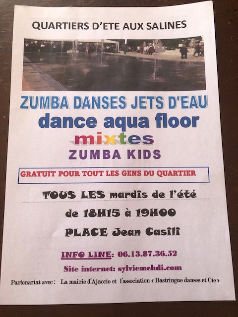 Et c’est reparti!!! Tous les mardis de 18h15 à 19H00 et tout l’été place Jean Casili c’est les « Quartiers d’été » aux salines!!! Gratuit pour tous les habitants du quartier et pour enfants/ados/adultes/seniors: Zumba danse jets d’eau.